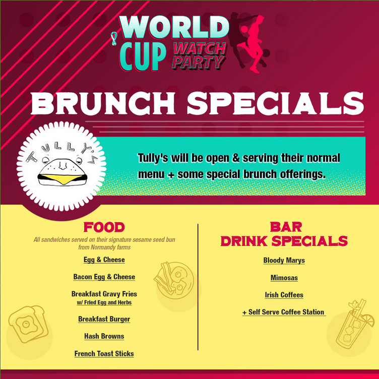 - The bar and Tully’s Kitchen will be open with specialty food and drinks