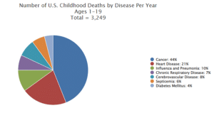 - Cancer remains the #1 disease killer of children, accounting for 44% compared with 21% for heart disease and just 10% for flu and pneumonia.