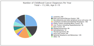 Nationwide, 2023 diagnosis estimates range from 15,850 (CDC) to nearly 17,000 (Children’s Oncology Group). The most common types in children ages 0 – 14 are Leukemia, Brain and central nervous system tumors, Neuroblastoma and Non-Hodgkin Lymphoma. In ages 15-19, the most common are Thyroid, Hodgkin Lymphoma, Brain and central nervous system, and Non-Hodgkin Lymphoma. In both age groups, boys are 35% more often diagnosed, with similarly higher death rates.