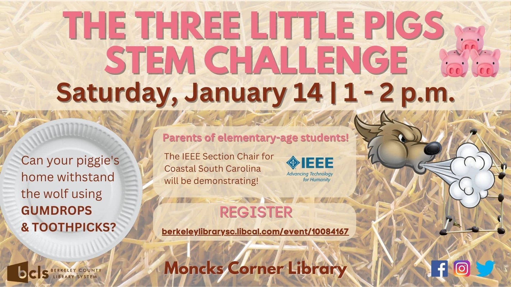 For more information on the The Three Little Pigs STEM Challenge or other BCLS programs, contact Florence Lewis-Coker at 843-719-4223 or florence.lewis-coker@berkeleycountysc.gov.