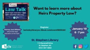 Berkeley County Library System (BCLS), in collaboration with the South Carolina Bar, invites customers to participate in Law Talk Series, Thursday, January 19th, from 6 pm to 7 pm at St. Stephen Library, located at 113 Ravenell Drive, St. Stephen. John B. “Jack” Williams, Esquire will discuss Heirs Property with a Q&A following the session.