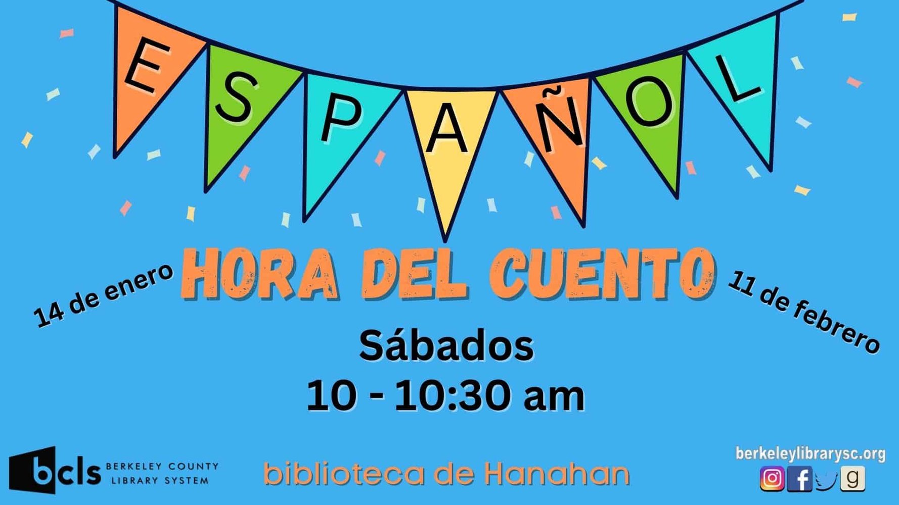 El sistema de bibliotecas del Condado de Berkeley (BCLS) y la biblioteca de Hanahan invita a los niños menores de 5 años* a participar de LA HORA DE CUENTO EN ESPAÑOL los días sábado 14 de enero y 11 de febrero de 2023 de 10:00 a.m. a 10:30 a.m. La narración de los cuentos en español y otras actividades estarán a cargo de voluntarios.