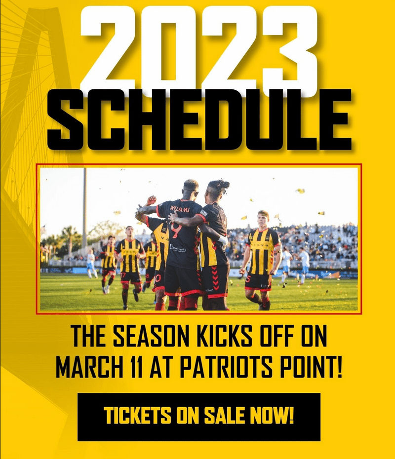 Charleston will play a 34-match schedule across 32 weeks from March through October. While still subject to change, all home matches will kick off at 7:30 pm except for three, the May 20th game against Monterey Bay FC and the final two games of the regular season, which will start at 5 pm.