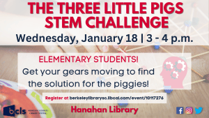 Berkeley County Library System (BCLS) in collaboration with the Coastal South Carolina Institute of Electrical and Electronics Engineers (IEEE) invites families with elementary-age students to participate in the The Three Little Pigs STEM Challenge on Wednesday, January 18th, 2023 from 3 pm to 4 pm at the Hanahan Library (1216 Old Murray Court). Interested parties can register at berkeleylibrarysc.libcal.com/event/10117276.
