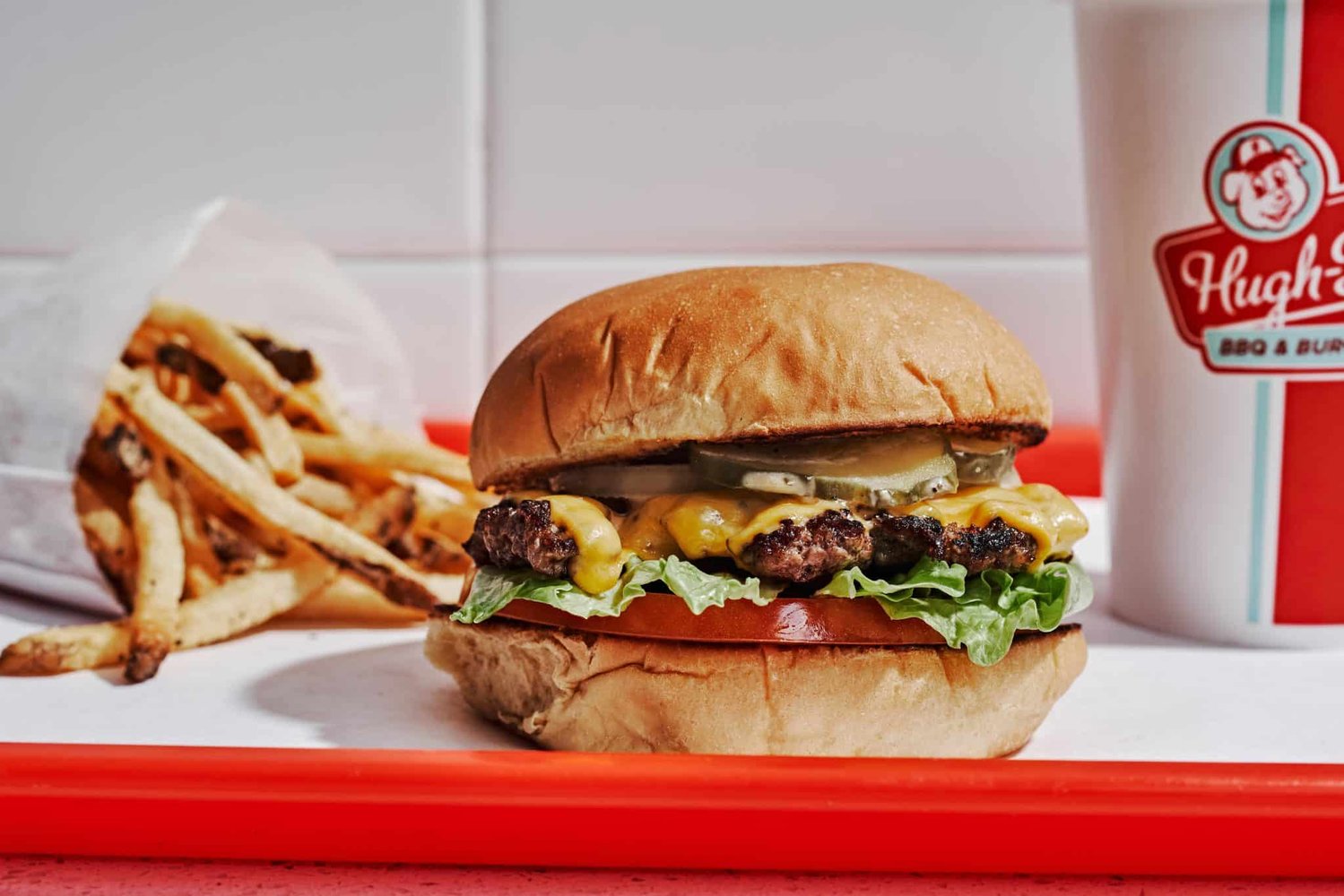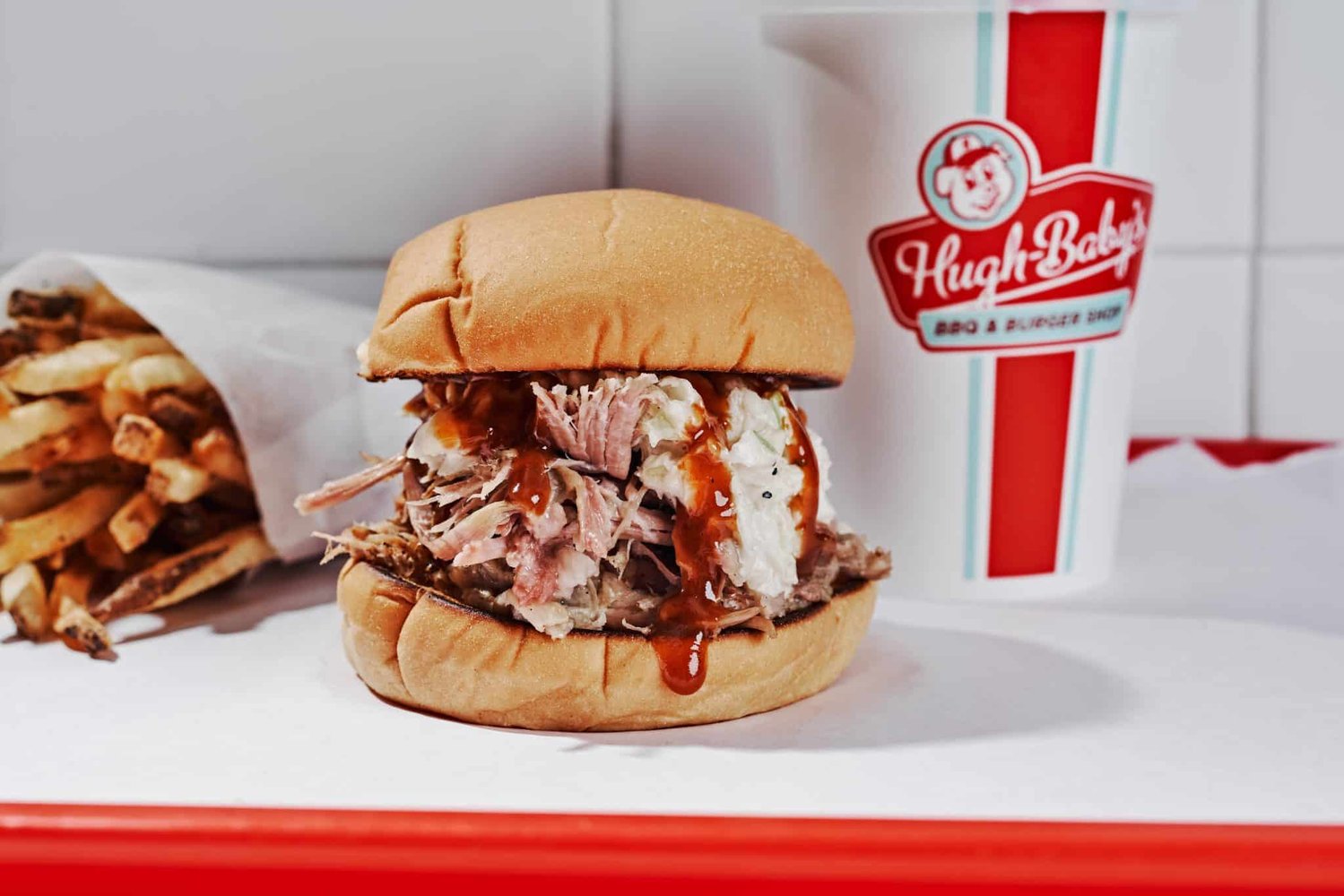 The restaurant says their burgers feature a blend of premium beef that is ground fresh daily. The barbecue sandwiches follow the traditions of Memphis-style barbecue, with the restaurant slow-smoking pork, turkey, and bologna onsite, every day. Menu highlights include Hugh-Baby’s signature Burgers (Classic Single or Double, BBQ Burger, Shroom & Swiss Burger), BBQ Sandwiches (Pulled Pork, Smoked Bologna, Smoked Turkey Club), and Hot Dogs. Other favorites include a Fried Chicken Sandwich, a Veggie Burger, French Fries, and milkshakes featuring chocolate, strawberry, and seasonal fruit flavors.