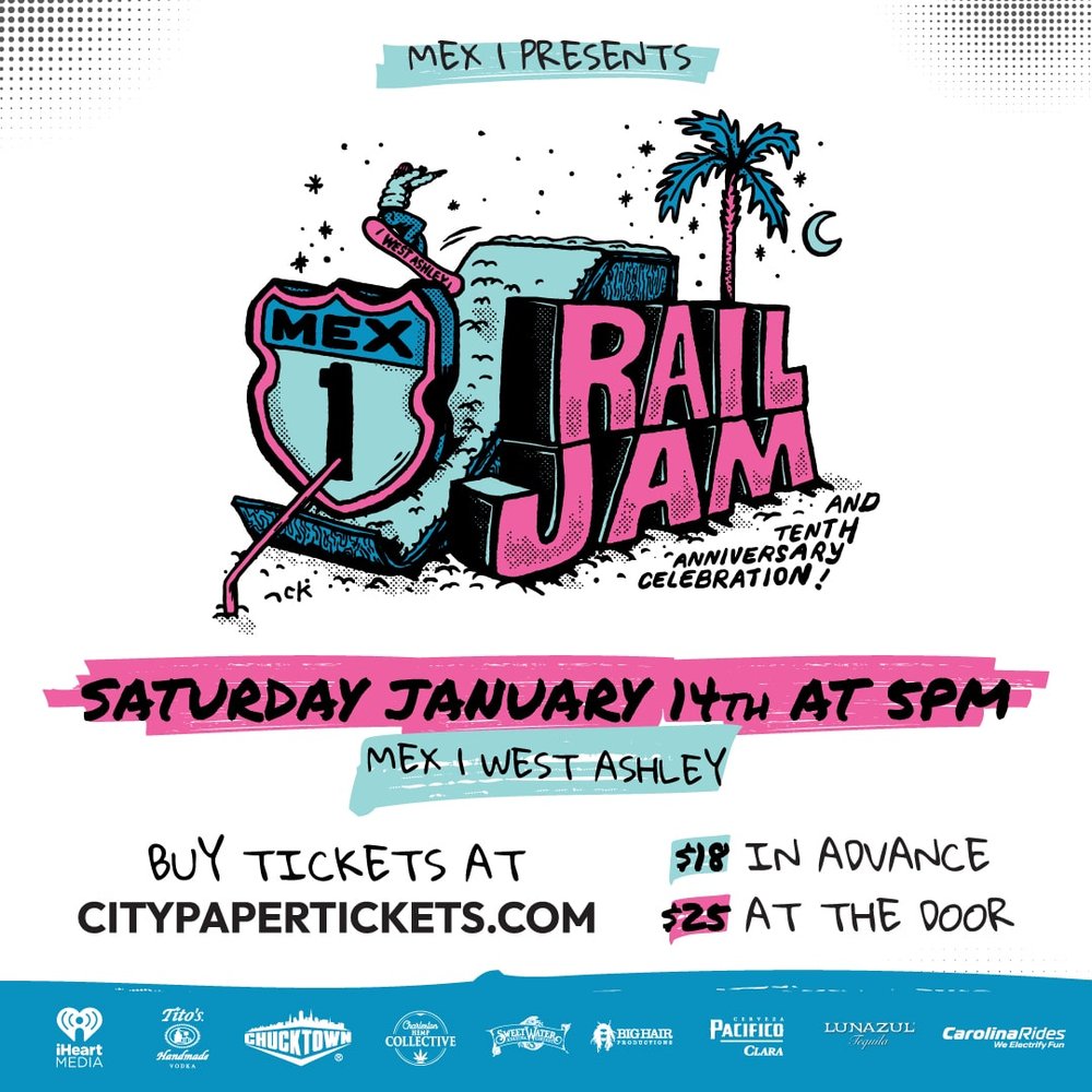 The Rail Jam will also commemorates Mex 1’s 10th anniversary at this flagship location (817 St Andrews Blvd.). In addition to the showboarders, guests can expect live music from the Strawberry Squad, visual effects and a laser show from Big Hair Productions, multiple outdoor bars, and food. Carolina Rides and Charleston Hemp Collective will be on-site as well.