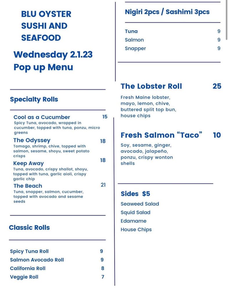 Guests can enjoy specialty sushi rolls and other Blu Oyster favorites while sipping on $2 off glasses of wine, courtesy of Odyssey Bottle Shop. You can see the food menu below:
