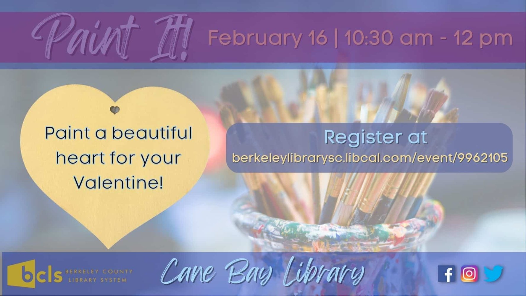 BCLS is pleased to provide customers with the opportunity to relax and create in a comfortable space. February’s project will be painting a wooden heart with paint provided by Friends of the Berkeley County Library.