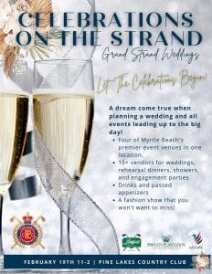 “Celebrations on the Strand” will be held February 19th from 11 am to 2 pm at Pine Lakes Country Club, allowing prospective brides and party planners to connect with the Grand Strand’s premier vendors while enjoying a lively atmosphere.