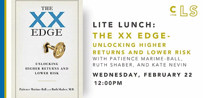 Charleston Library Society returns on its investments with a Lite Lunch with Patience Marime-Ball, Ruth Shaber, M.D., and Kate Nevin as they discuss Marime-Ball and Shaber’s book, The XX Edge: Unlocking Higher Returns and Lower Risk.