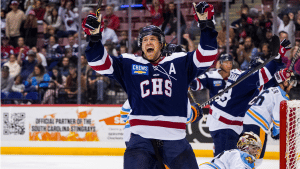 South Carolina tied the game 22 seconds later as Jackson Leppard buried his ninth tuck of the season. Anthony Del Gaizo deflected a clearing attempt from Tendeck where Leppard found the loose puck and shoveled it into the goal for the 3-3 game.