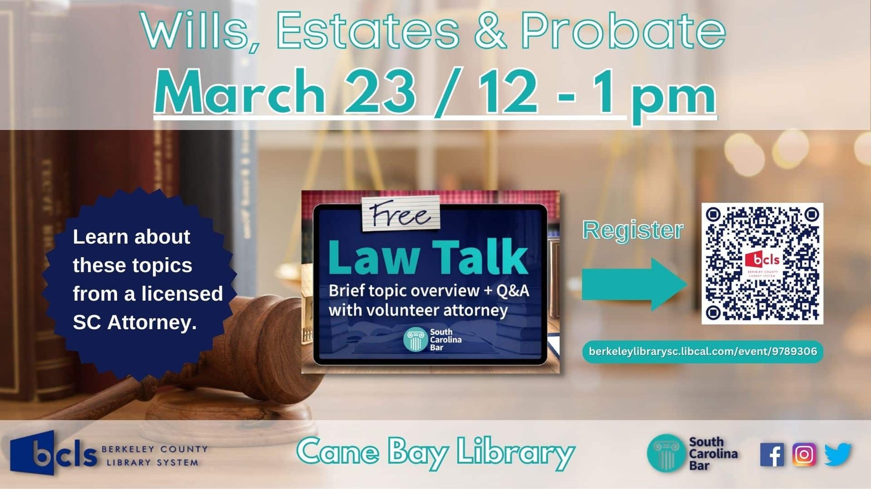 For more information on Law Talk or other BCLS programs/events, contact Heather Bennett at 843-719-4796 or heather.bennett@berkeleycountysc.gov.