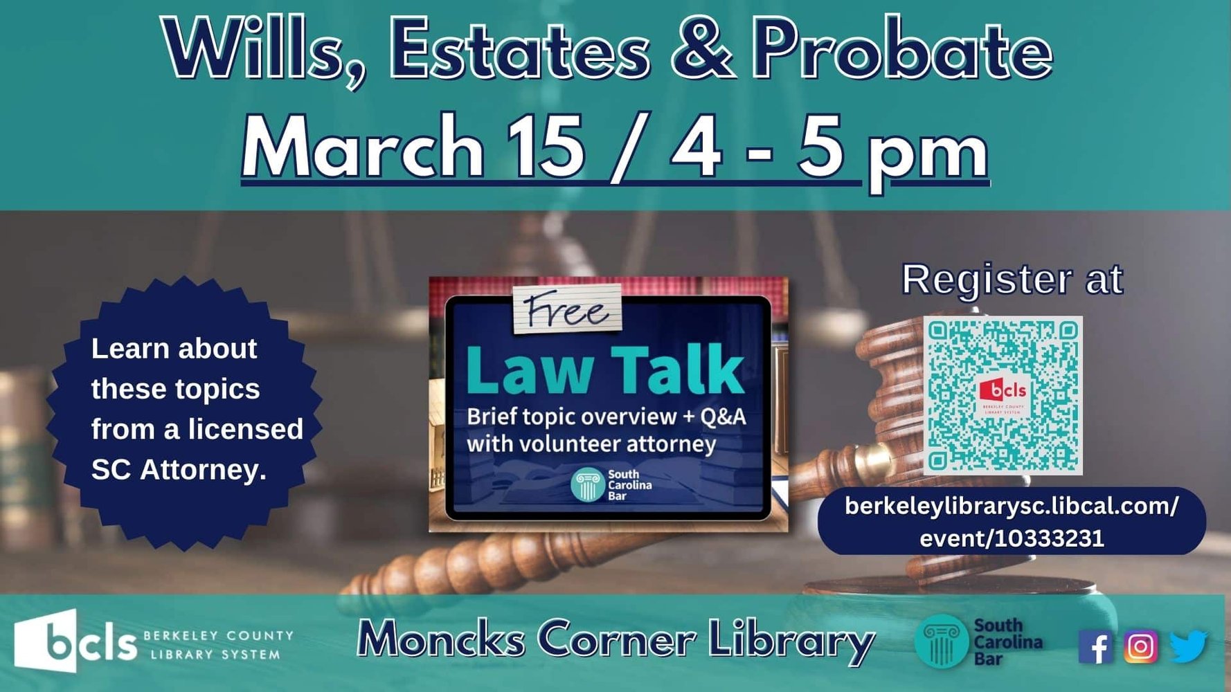 Berkeley County Library System (BCLS), in collaboration with the South Carolina Bar, is co-hosting Law Talk: Wills, Estates and Probate on Wednesday, March 15th, from 4 to 5 pm at Moncks Corner Library, located at 1003 Highway 52, Moncks Corner. The three topics will be presented by Malena Dinwoodie, Esquire.
