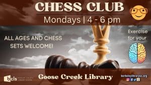 “Chess players of all ages and levels are invited to play at the Goose Creek Library every Monday,” said Nanette Hamilton, Senior Branch Librarian “Give your brain some exercise and meet other chess players.”