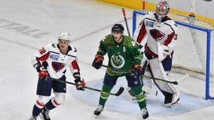 Greenville added another marker on Brannon McManus’ 10th tuck of the year. McManus collected the puck behind the net and skated out in front before lifting a tight-angle shot past the glove of Stevenson for the 3-0 advantage at the 3:33 mark of the second period.