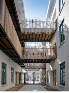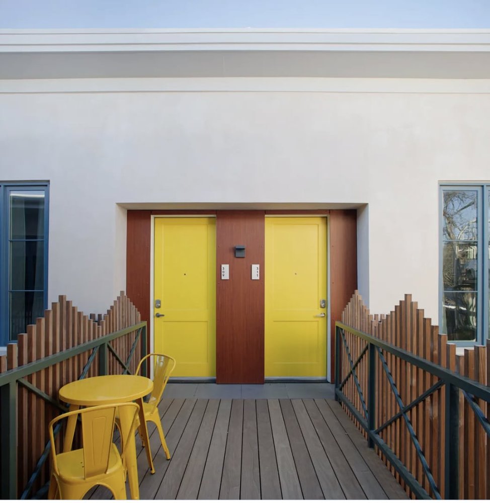 The Iris offers 27 short term rentals and 6 affordable housing units. A look at the two connected buildings provokes curiosity. The structure resonates with the low rise skyline and lively vibe in this neighborhood of late 19th and 20th Century homes. But, it is also clearly a 21st century design with a nod to mid Century style. Maybre Osborne, Company President, and Shannon Ross, Company Vice President, explain that there’s a mid Century feel with a classic design that will forever be timeless.
