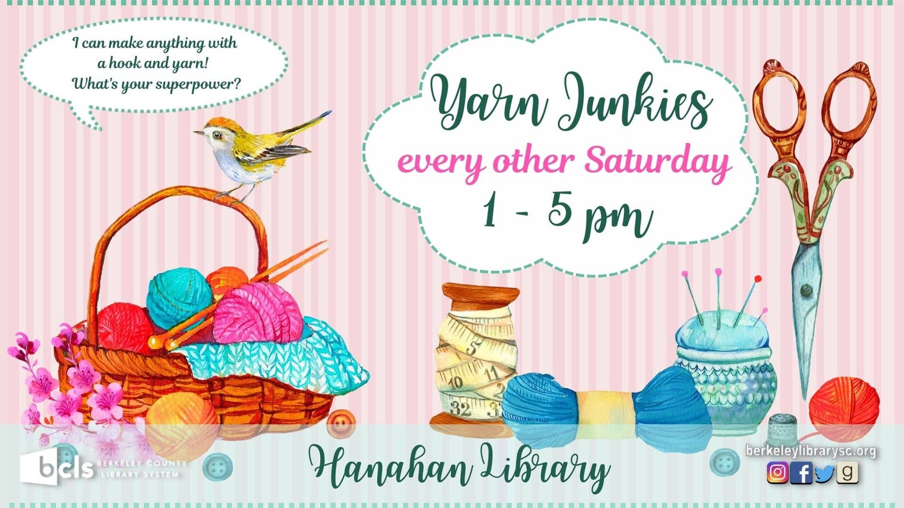 For more information on Yarn Junkies or other events/programs at the Hanahan Library, contact Kirstin Steele at 843-553-0047 or kirstin.steele@berkeleycountysc.gov.