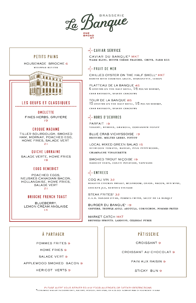 Guests can enjoy French classics including Croque Madame, Quiche Lorraine, and Brioche French Toast, plus raw offerings like chilled oysters, and some Brasserie la Banque favorites, including Coq au Vin, Steak Frites, and the Burger de Banque.