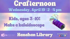 Berkeley County Library System (BCLS) invites ages 3–10 to Crafternoon to create a kaleidoscope on Wednesday, April 19th from 2 pm to 4 pm at the Hanahan Library, located at 1216 Old Murray Court, Hanahan. All materials for crafting are included along with coloring sheets for younger children. Crafternoon will continue every third Wednesday with different activities.