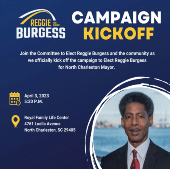 The kickoff will be Burgess’s first official campaign event after announcing his bid For North Charleston Mayor on March 24th.