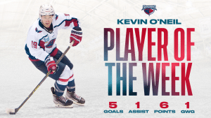 The ECHL announced today that Kevin O’Neil of the South Carolina Stingrays has been named the Inglasco/ECHL Player of the Week for the week of March 27-April 2. It is the first time in O’Neil’s career that he has received the league’s weekly honor.