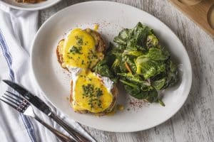 • Eggs Florentine Benedict – Sautéed spinach, poached eggs, hollandaise, and nutritional yeast on an english muffin