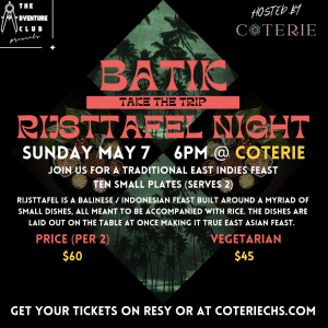 Each meal will be meant for two people and only two options will be offered this night (as is tradition): meat or vegetable. Guest bartender Aneel James will be behind the bar for this takeover. Please see below for pricing (price per two):