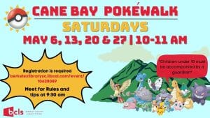 The Berkeley County Library System (BCLS) invites all ages to participate in Cane Bay Pokéwalk at the Cane Bay Library, located at 1655 Cane Bay Blvd. in Summerville. The program will occur May 6th, 13th, 20th, and 27th, from 9:30 am – 11 am.