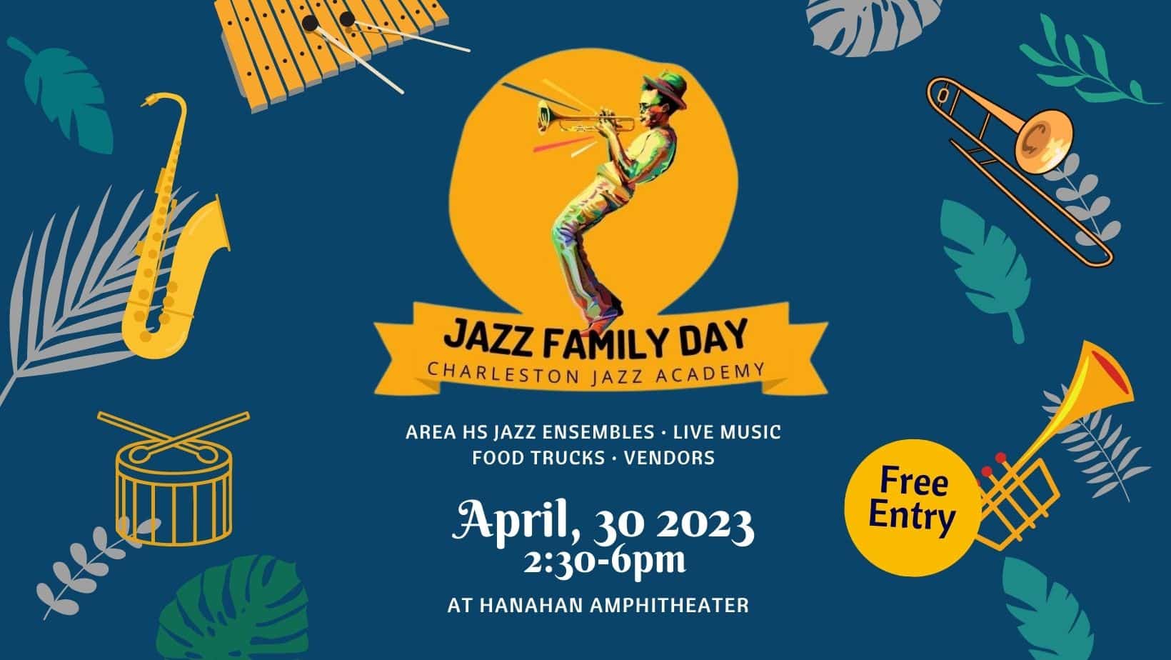 Attendees can enjoy live music by area high school ensembles, food trucks (Sombrero Wok and Kona Ice), vendors, and more. Featured bands include: Berkley All-County Jazz Band, Charleston Jazz Academy Combos, Lucy Beckham High School, Cane Bay High School, Wando High School, School of the Arts, and Charleston All-Star Jazz Band.