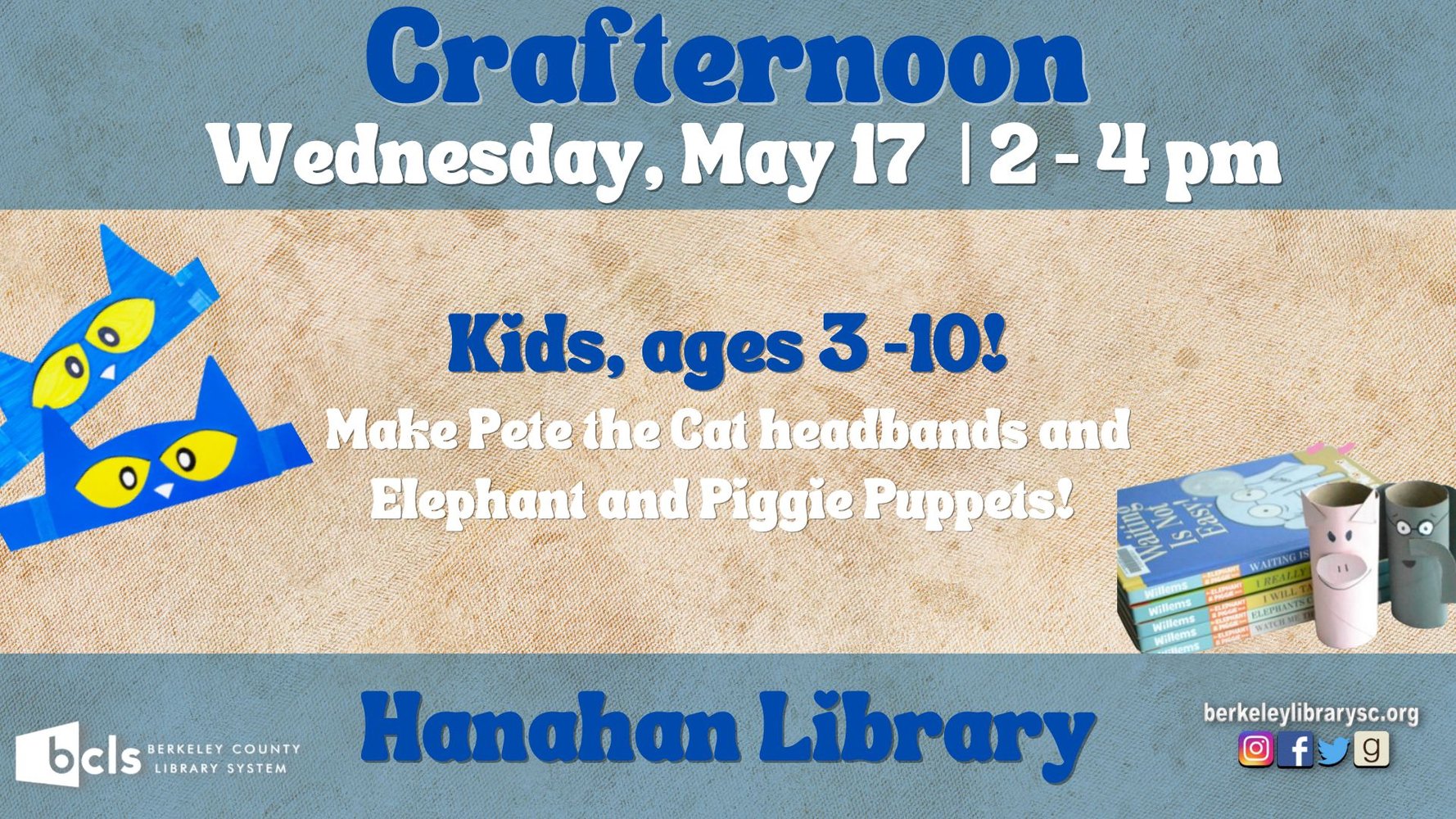 Berkeley County Library System (BCLS) invites ages 3–10 to Crafternoon to create Pete the Cat headbands, and Elephant and Piggie Puppets on Wednesday, May 17th from 2 pm to 4 pm at the Hanahan Library, located at 1216 Old Murray Court, Hanahan. All materials for crafting are included along with coloring sheets for younger children. Crafternoon will continue every third Wednesday with different activities.