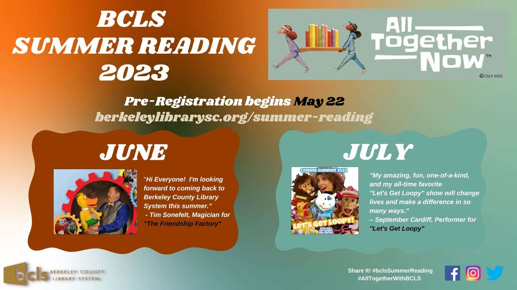 Berkeley County Library System (BCLS) 2023 Summer Reading Program invites preschool age to adult to participate in Summer Reading and win prizes! This year’s theme for Summer Reading is All Together Now.