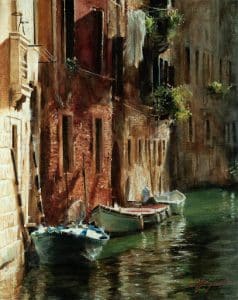 Splashing waves of Venetian canals, the stillness of a sun-soaked street during siesta, the vibrant atmosphere of small-town European streets and quaint corners of the world, are all subjects of the upcoming show “Between Heaven and Earth.”