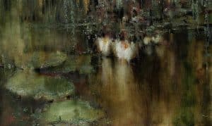 “OLD POND” (right) a 24” X 40” oil on canvas, depicts a serene pond with waterlilies and koi fish, and well represents one of Trofimov’s treasured places and travel memories. “VENETIAN SUN” (above right) a 30” X 24” oil on canvas will surely bring memories of the colors and textures to those fortunate to have visited the magical city.