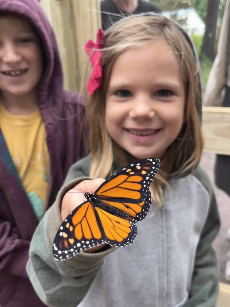In the summer of 2022, in Katie’s Krops Outdoor Classroom, 4-H leader Molly Jones taught a class on the endangered monarch butterflies. Jones shared how young attendees could help save the butterflies. The children quickly made it their mission to aid these beautiful creatures. The group, comprised of young Katie’s Krops volunteers between the ages of one and ten, began their efforts to save and tag Monarch butterflies on their migration. In 2023 they have dramatically increased their efforts.