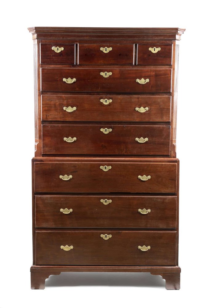 The Charleston Museum, located at 360 Meeting Street in downtown Charleston is pleased to announce the addition of a Charleston-made double chest to its collection of early Lowcountry furniture. The mahogany and cypress chest, attributed to the shop of Charleston cabinetmaker William Carwithen (1704-1770), features distinct construction details that are shared with a marked Carwithen desk, held in MESDA’s collection. This recent Charleston Museum acquisition is the earliest known example of the double chest—or “chest on chest”—form, c. 1735-1750. Double chests were documented in the Lowcountry from the 1730s and remained popular through the American Revolution, to the exclusion of other types more popular elsewhere in British America.