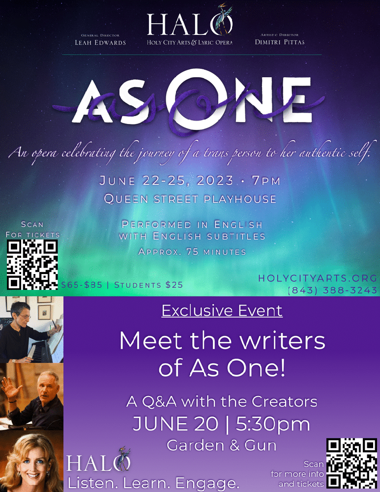It’s an exciting time when you get to see an opera becoming a part of the standard repertoire. In a brand new production and the professional South Carolina premiere, Holy City Arts & Lyric Opera—HALO—presents As One in a dramatic conclusion to their 2022/23 Season. The immersive experience utilizes elements including lobby exhibitions, video projections, and surround sound for spoken word to welcome an audience of opera aficionados and newcomers alike.