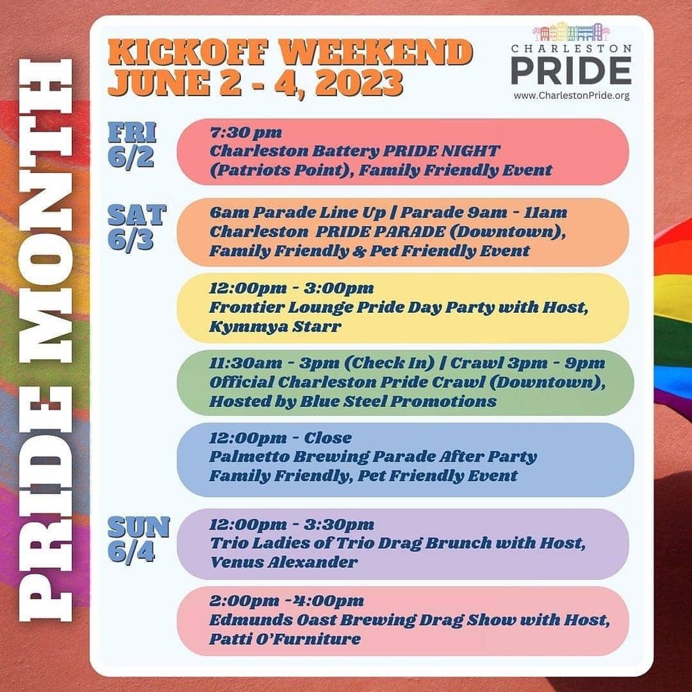 - June 3 at 9:00 a: Charleston Pride Parade on King St. (Family and Pet Friendly)