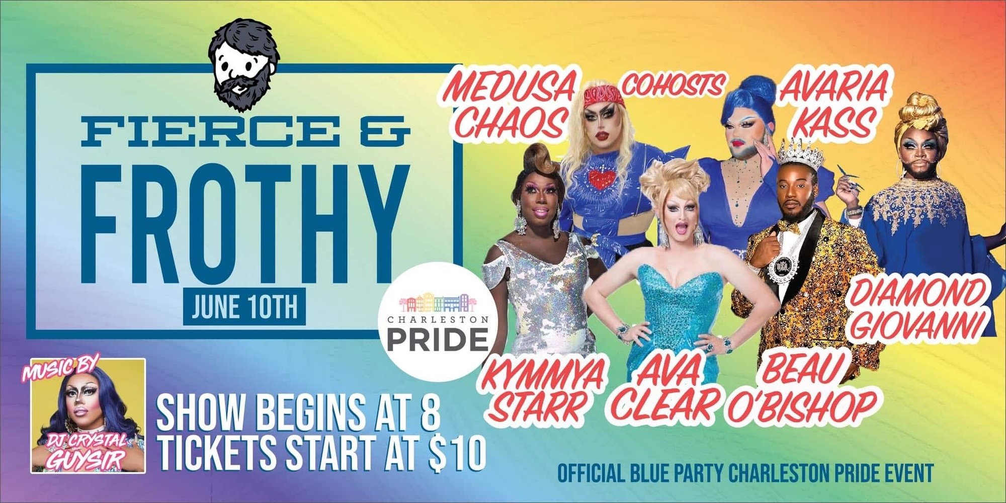 June 10 at 8 p: Fierce & Frothy Charleston Pride Blue Party featuring Avaria Kass, Ava Clear, Kymmya Starr, Beau O’Bishop, Diamond Giovanni, Medusa Chaos, and DJ Crystal Guysir! (21+)