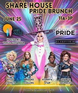 - June 25 at 11 a: Sharehouse Pride Brunch featuring Brooke Collins, Kymmya Starr, Shariese Ses Pieces, Kylee Lovely, DJ Trevor D, and Venus Alexander! (21+)