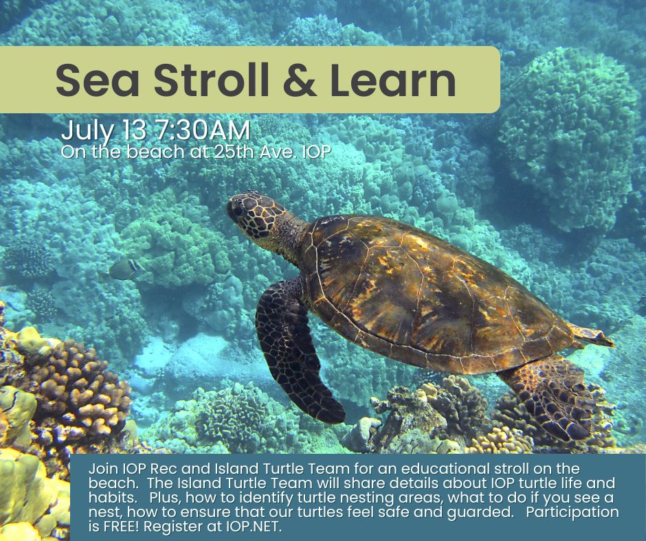 The City of Isle of Palms Recreation Department and Island Turtle Team will host a Sea Stroll & Learn on the beach at 25th Avenue on Thursday, July 13th, 2023, at 7:30 am. The event is FREE for residents and visitors.