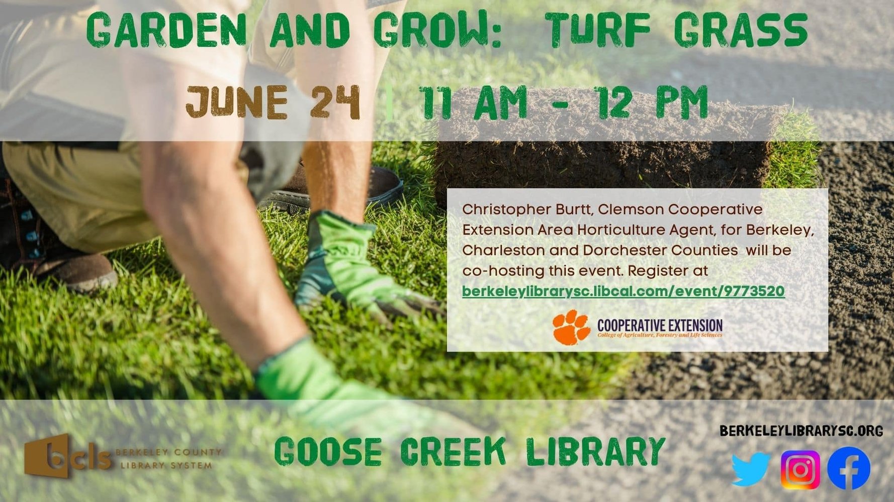 Berkeley County Library System (BCLS) will co-host Garden and Grow: Turf Grass with Christopher Burtt, Cooperative Extension Area Horticulture Agent, for Berkeley, Charleston and Dorchester Counties, on Saturday, June 24th, 2023 from 11 am to 12 pm. The event will take place at Goose Creek Library, located at 325 Old Moncks Corner Rd., Goose Creek. Please register at berkeleylibrarysc.libcal.com/event/9773520. The event is sponsored by Friends of the Berkeley County Library.