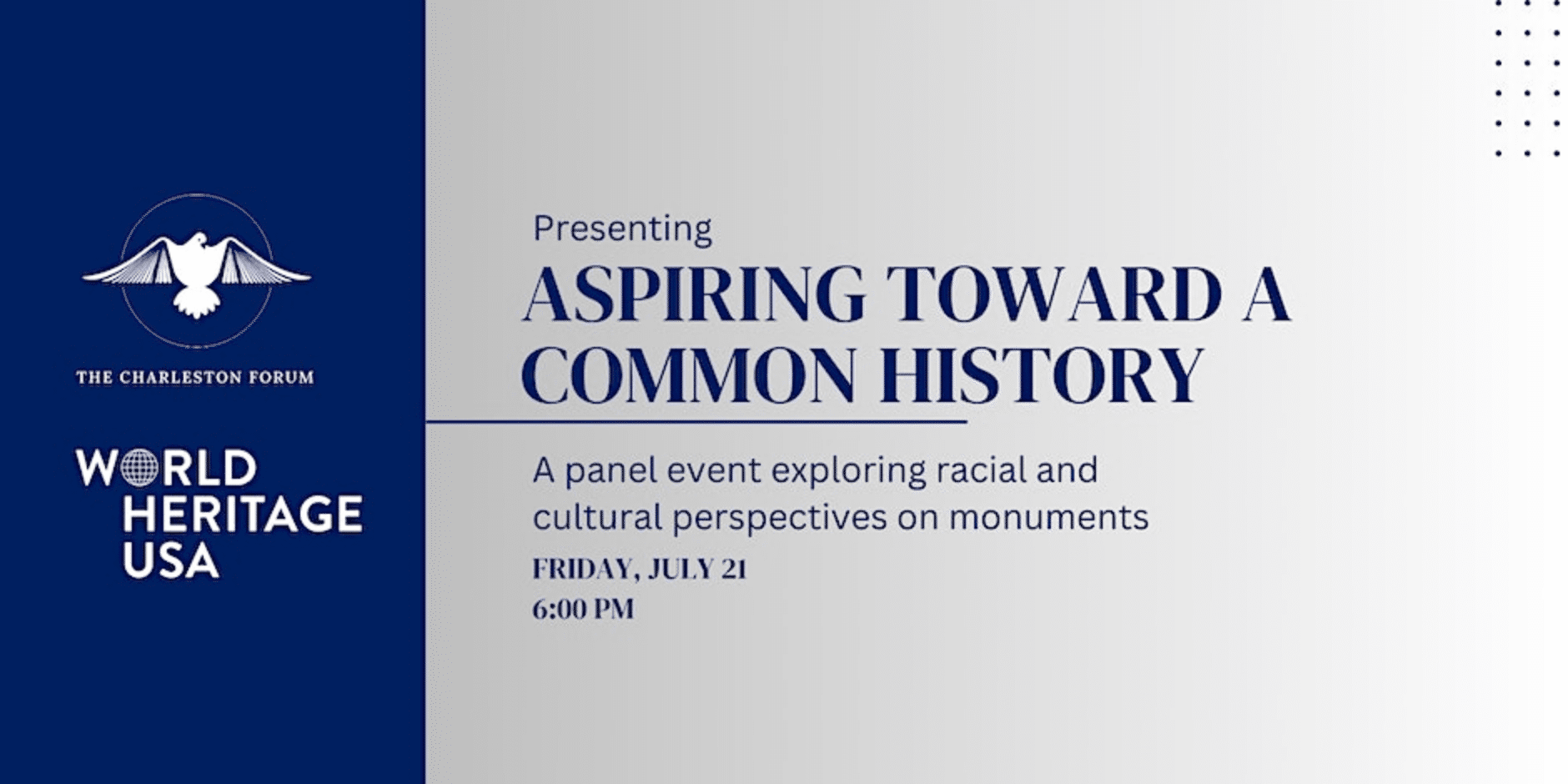 “World Heritage USA is delighted to partner with The Charleston Forum, an organization that has been at the forefront of facilitating important conversations about the future of our past, to bring this event to the Charleston community,” said Doug Comer, President of World Heritage USA. “As we travel coast to coast with this series, we hope to reach diverse audiences to engage them in meaningful dialogue about the monuments landscape in these culturally and historically rich cities.”