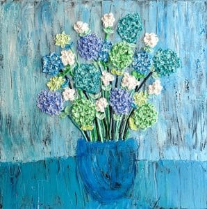 The show’s signature piece, “A Springtime Kaleidoscope” a 30” x 40” acrylic on canvas, depicts a splendidly sculpted collection of wildflowers that leap off of the canvas and stretch to the sky over a serene backdrop. Another painting, “Hydrangeas in Blue Vase” a 24” x 24” acrylic on canvas, showcases bright, blooming hydrangeas in a unique impasto portrayal of a floral still-life.