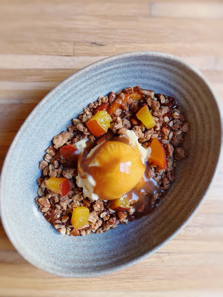 Pastry Chef Spitzer showcases peach leaves and the sweet peach itself in her “Peach Crisp” (pictured above). This beloved Southern classic takes on a new dimension— composed of compressed peaches, oat & pecan Streusel, sweet tea caramel, peach leaf, and Amaretto ice.