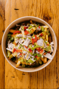 Showcasing the flavors of Peru, Pollo Fries are hand-cut french fries topped with VIVA’s signature pulled rotisserie chicken, red peppers, green onions, and made in-house, daily yellow and green sauces.