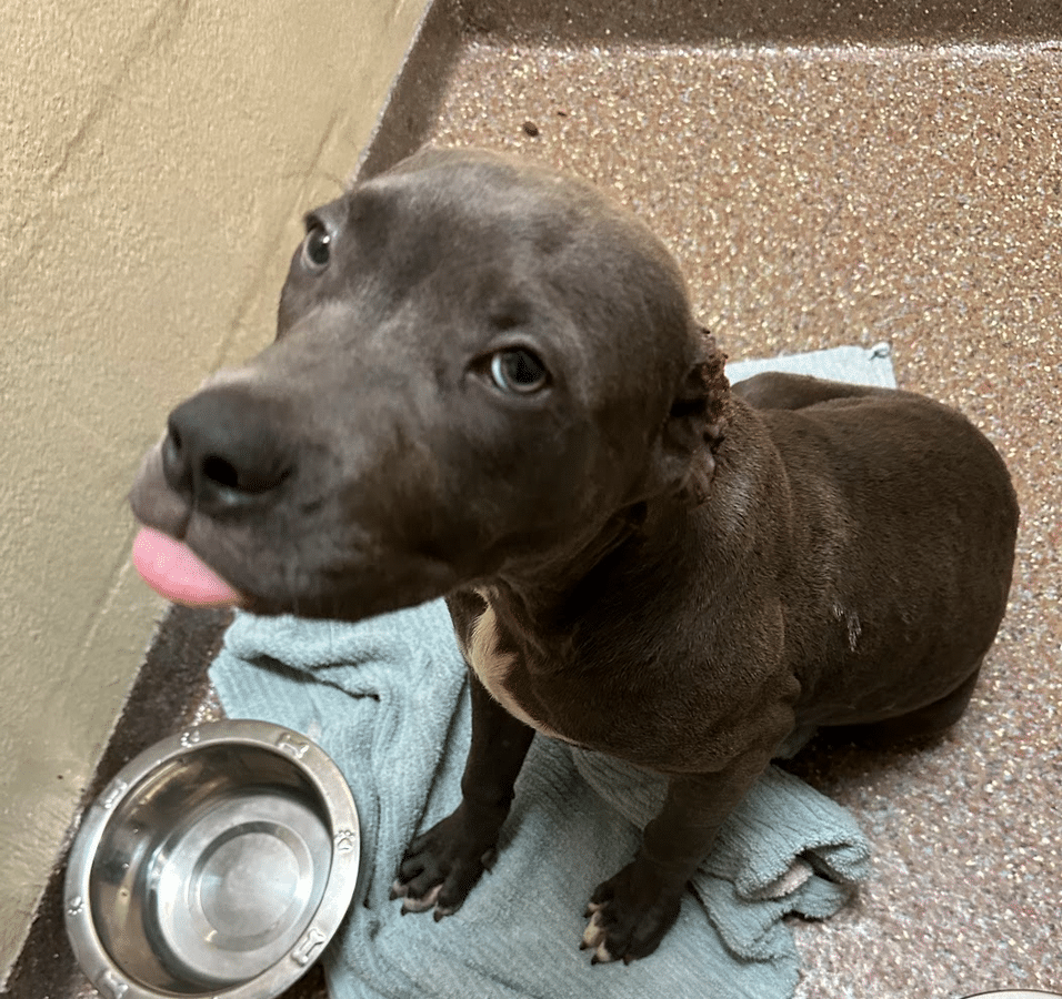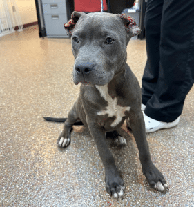 Part of the dog’s right ear had to be removed as the cuts were too deep to salvage it. No other injuries were detected in the examination of the dog. Despite everything this pittie-mix has been through, the dog is very sweet and has been friendly to staff at the shelter.
