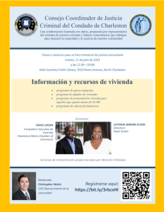 The Charleston County Criminal Justice Coordinating Council (CJCC) will host a Community Justice Forum at the Keith Summey Public Library on Tuesday, July 11th from 5:45 pm to 7 pm. During the forum, titled “Housing Information and Resources/ Información y recursos de vivienda,” panelists will share information about how to connect with wrap-around support programs, home rental programs, home ownership programs for those earning less than $110K, and financial literacy programs.
