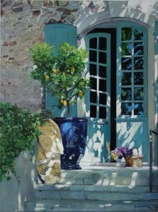 According to Courchia, during the summer in Provence there are three components that he tries to capture in his paintings: the heat, the shadows and the freshness. All three contain some of the color blue. Blue is one of the colors most associated with Provence, and is dominant within Courchia’s vibrant color palette, as seen in “La Fenêtre Entrouverte” (The half-open window) a 30” X 40” oil on canvas.