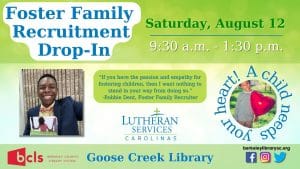 Berkeley County Library System (BCLS), in collaboration with Lutheran Services Carolinas, invites customers to participate in Foster Family Recruitment Drop-In to learn about fostering from Robbie Dent, Foster Family Recruiter. The event will be on Saturday, August 12nd, 2023 from 9:30 am to 1:30 pm at Goose Creek Library, located at 325 Old Moncks Corner Road, Goose Creek.