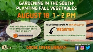 Berkeley County Library System (BCLS) will co-host Gardening in the South: Planting Fall Vegetables with Christopher Burtt, Clemson University Cooperative Extension Area Horticulture Agent, for Berkeley, Charleston and Dorchester Counties, on Thursday, August 10, 2023 from 1 pm to 2 p.m. The event will take place at Goose Creek Library, located at 325 Old Moncks Corner Rd., Goose Creek. Please register at berkeleylibrarysc.libcal.com/event/10864228. Registration opens at 1 p.m. on July 27.